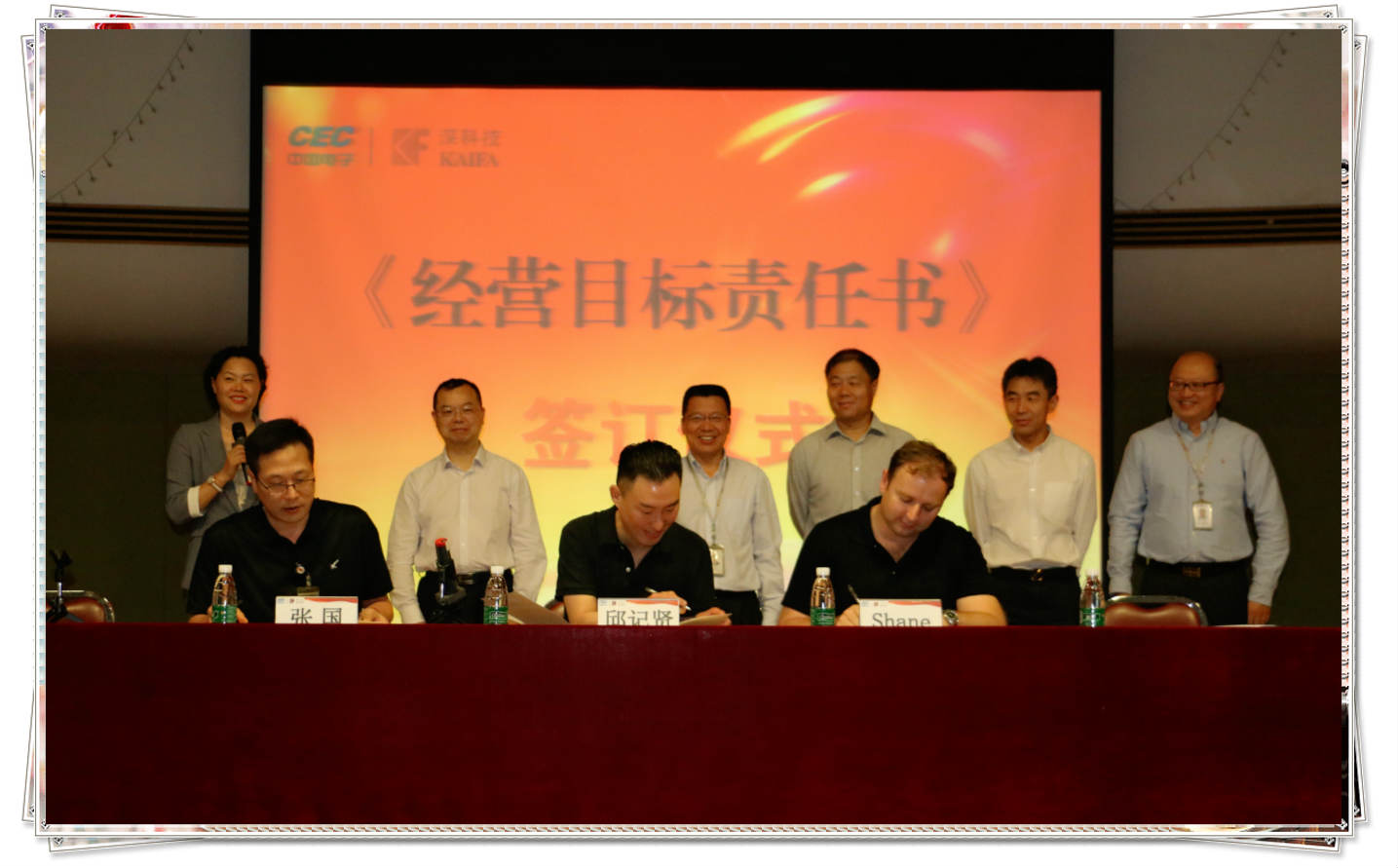 (↓ 莫總與開發(fā)蘇州總經理史初浪、開發(fā)惠州總經理謝少華、開發(fā)東莞總經理王勁剛、關鍵零部件事業(yè)部總經理熊維龍簽署經營目標責任書)